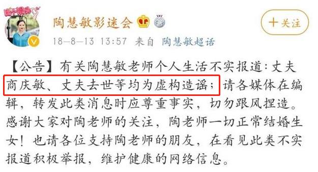 以至于自己丈夫“被外界所造谣去世,自己守寡10年”的消息被传的无法收场,陶慧敏才出面辟谣!