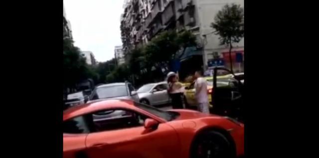 一驾驶保时捷的女司机在调头时与另一辆车的男司机发生口角。原因是女司机未按规定调头,却认为男司机堵着了自己的路。
