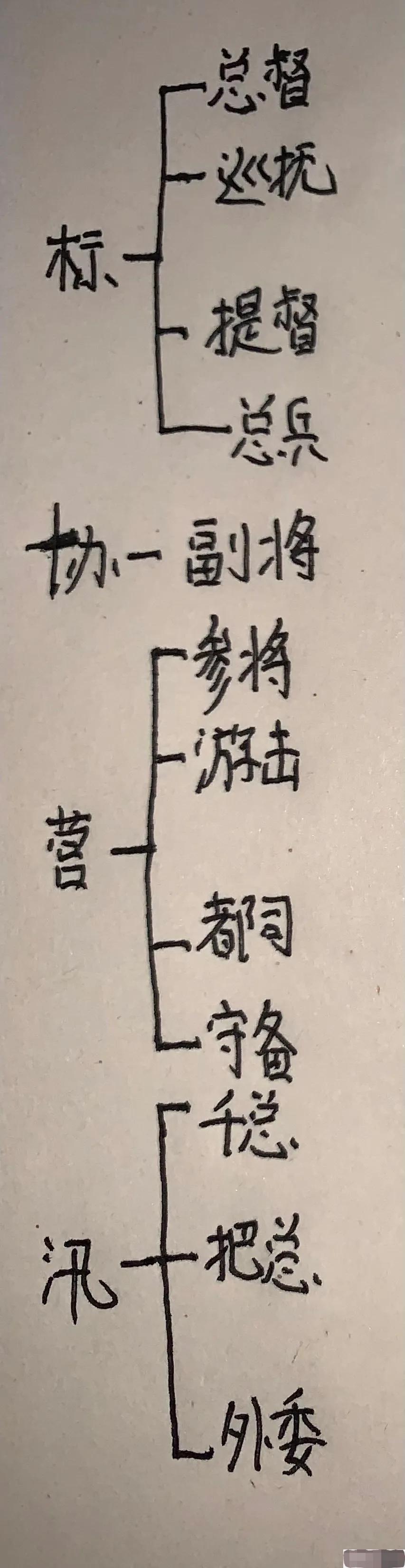 从编制上看,全国绿营兵共有12个层级官爵,根据嘉庆朝《大清会典》,统辖全国绿营兵的有总督11人、巡抚15人、提督19人、总兵56人、副将108人、参将152人、游击311人、都司423人、守备715人、千总1515人、把总3133人、外委4256人。其中总督、巡抚、提督、总兵麾下都有其专门负责的直属部队,分别是督标、抚标、提标、镇标。当然,也有些特殊单位,比如四川成都将军管辖绿营兵,这部分被将军直属的绿营兵被称为军标、而河道总督的直属绿营兵被称为河标、漕运总督的直属绿营为漕标。而这些定名为“标”的直属部队随着层级不同分为2到5个“营”(注意和下面所说的营不同,这是标一级所属的营队),一般来说以左、右、前、后、中来命名。