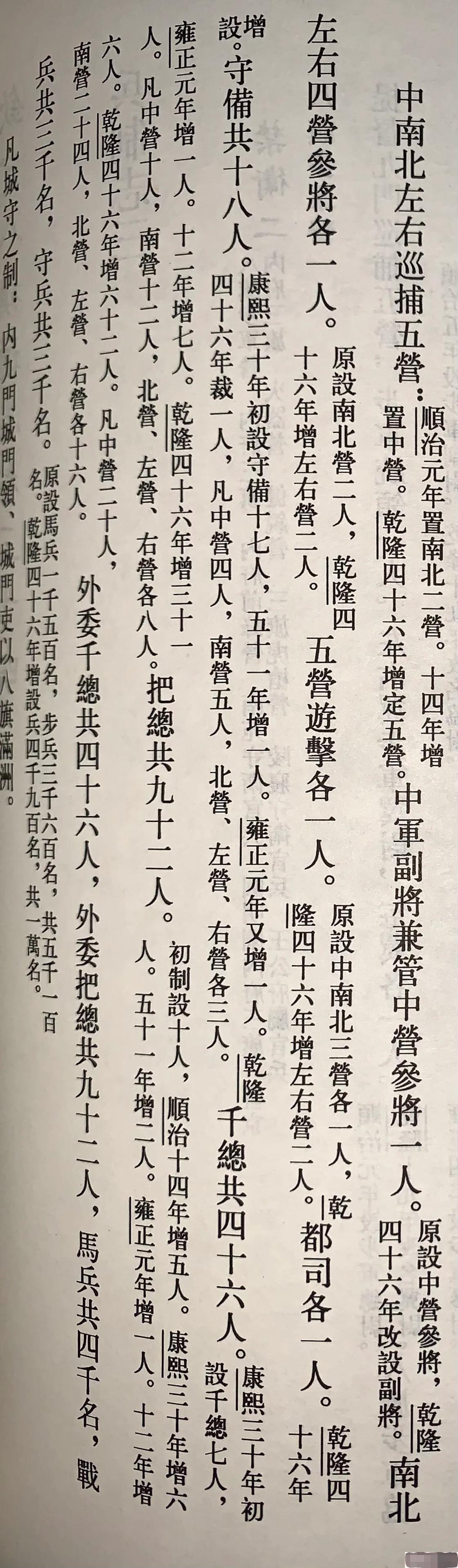此兵设于顺治元年,原是只有南、北两营兵马。后于顺治十四年增置中营。乾隆四十六年,由于“稽查巡缉更觉耳目难周,所有从前额设官兵不敷派拨”,遂又增加左、右二营,遂成南、北、中、左、右巡捕五营编制,至此成为中叶以后巡捕营的定制。兵员常年保持在10000人左右,构成有马兵4000人、战兵3000人、守兵3000人。