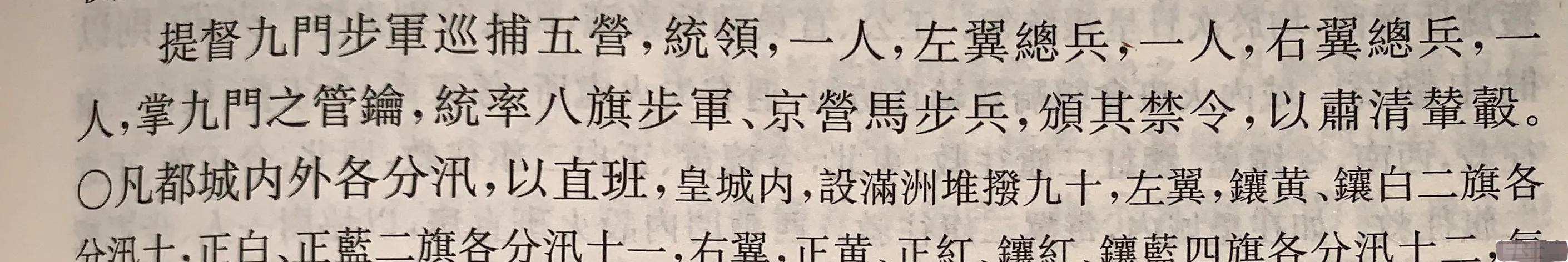 根据《钦定八旗通志》,其职官构成有副将1人,参将4人、游击5人、都司5人、守备18人、千总46人、把总92人、外委千总46人、外委把总92人。当然,不同文献、时代军官数量有所不同,但数字变动并不大。而整个巡捕五营受步军统领的统一指挥,但据嘉庆朝《大清会典》记载,又设左、右两翼总兵以分步兵统领之权力,这应该是有鉴于乾隆时期和珅以首辅兼步军统领的流弊而引起的。