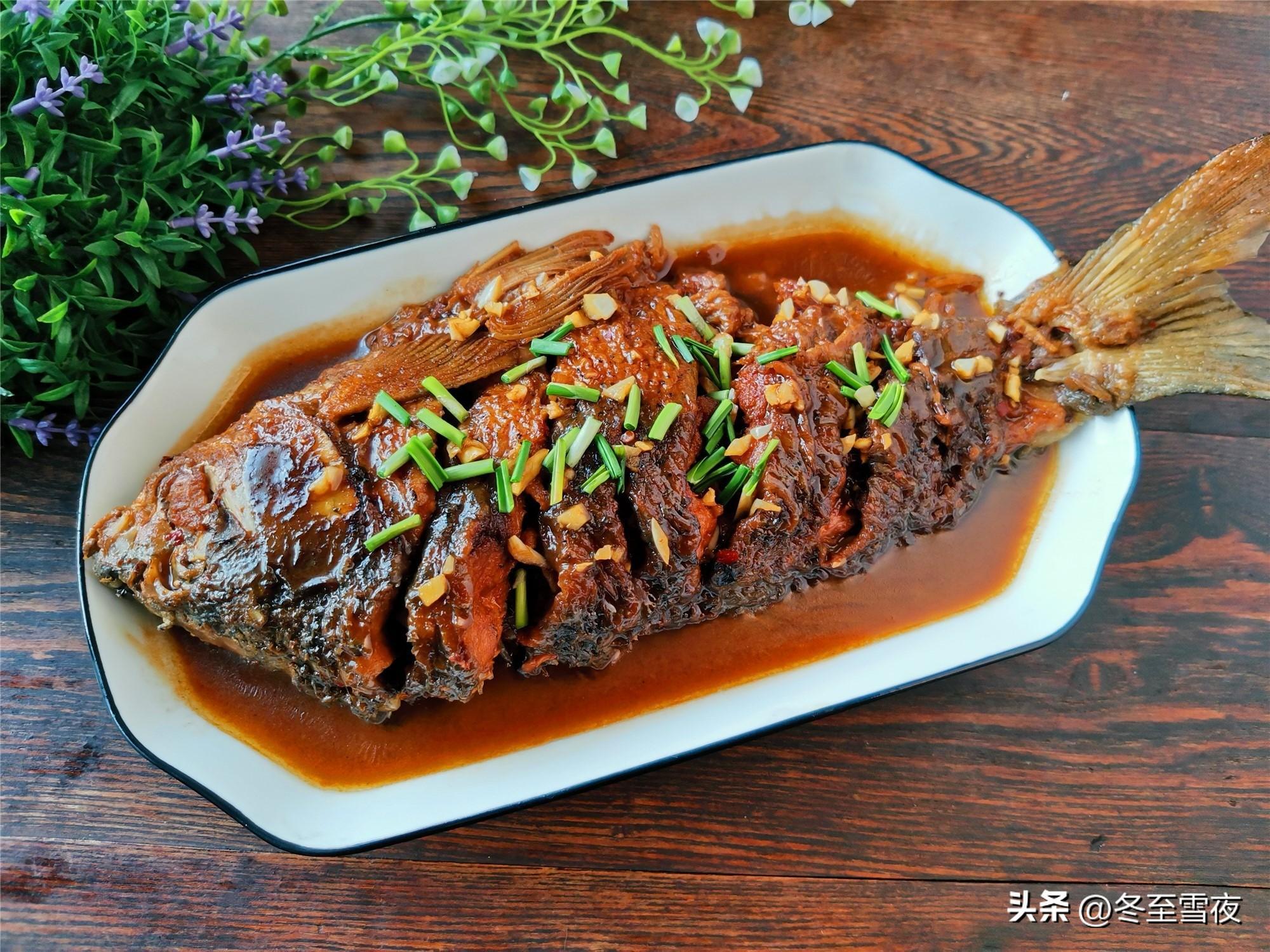 8.炖制剩少许汤汁时,撒上蒜末,用大火收汁,收至汤汁变黏稠,关火,将鱼盛出装盘,撒上香菜末或者葱花都可以。一盘家常炖鱼就做好了。