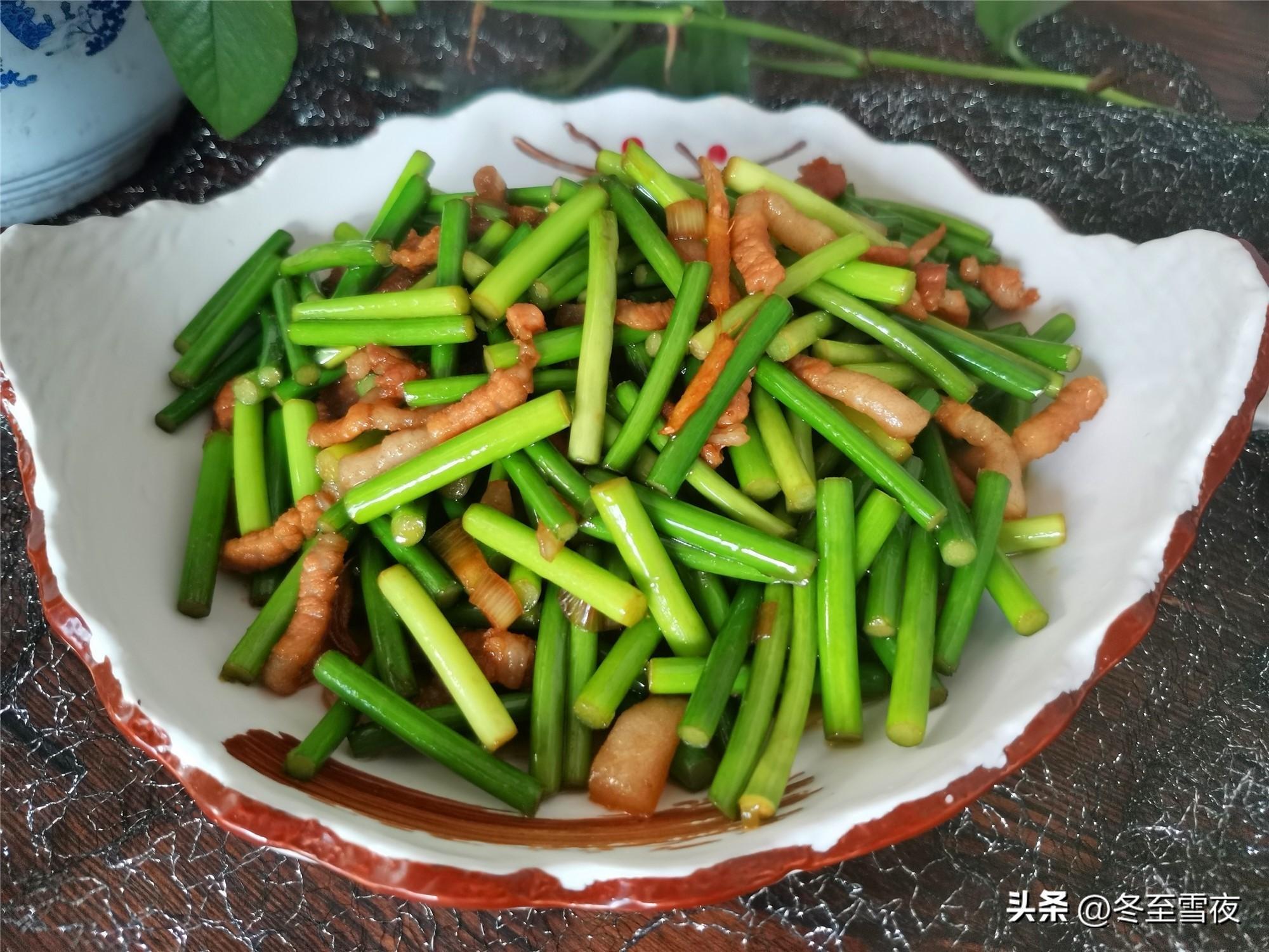 第十一道:【蒜薹炒肉丝】所需材料:蒜薹半斤、猪肉150克、油盐适量、姜2片、生抽1汤匙、红烧酱油少许、料酒半汤匙、