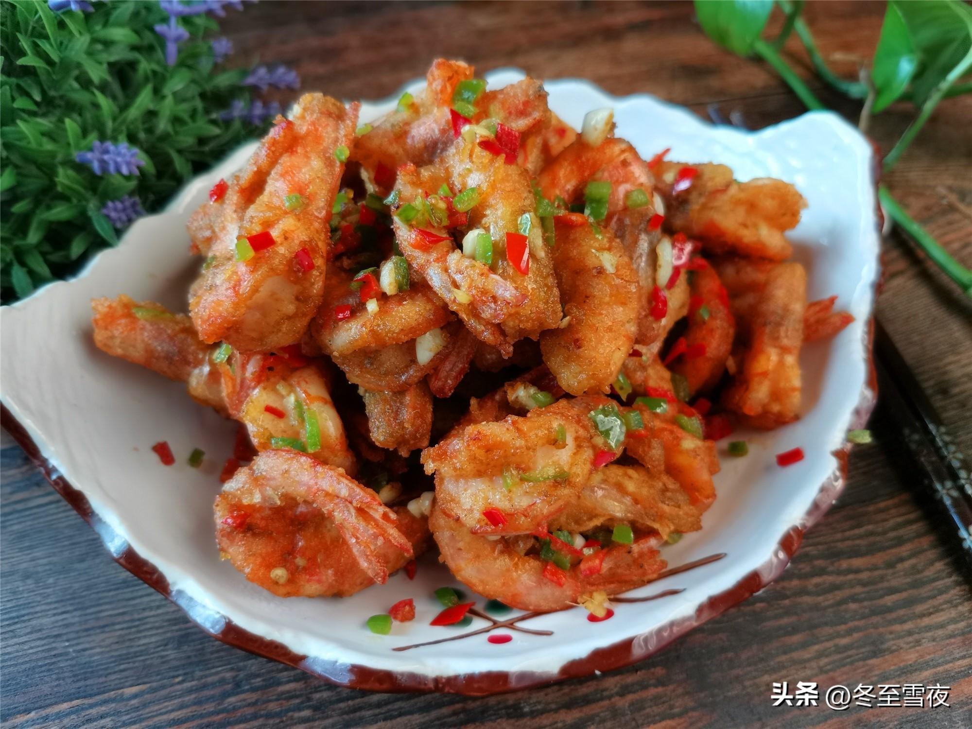 8.再下入炸好的大虾,撒入椒盐,快速翻炒均匀,关火,盛出装盘即可,一盘香酥味美,椒香味浓的大虾就做好了。