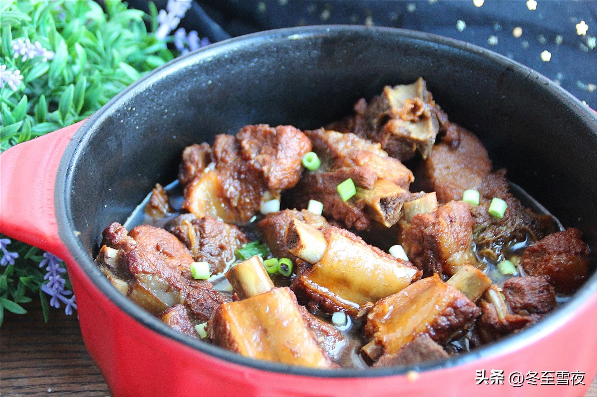 第三道:【炖排骨】所需材料:排骨2斤、油盐适量、葱1段、姜1块、大蒜2瓣、花椒10几粒、大料2个、香叶3-4片、干辣椒2-3个、生抽2汤匙、红烧酱油半汤匙、冰糖10几粒、料酒1汤匙、白胡椒粉1茶匙、