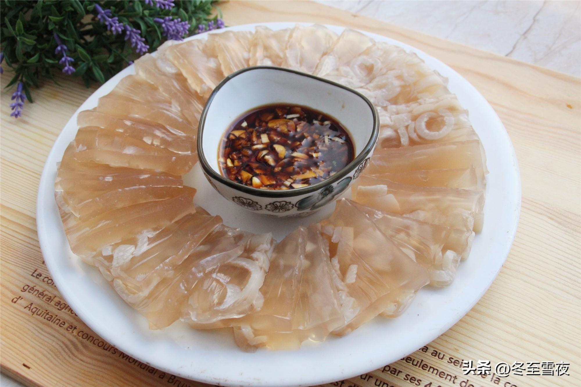 10.把肉皮和汤汁倒入容器内,晾凉,放入冰箱内冷藏一晚上,使汤汁凝固,第二天就可以吃了,切成片,配上蒜末加酱油的蘸料,蘸食即可。