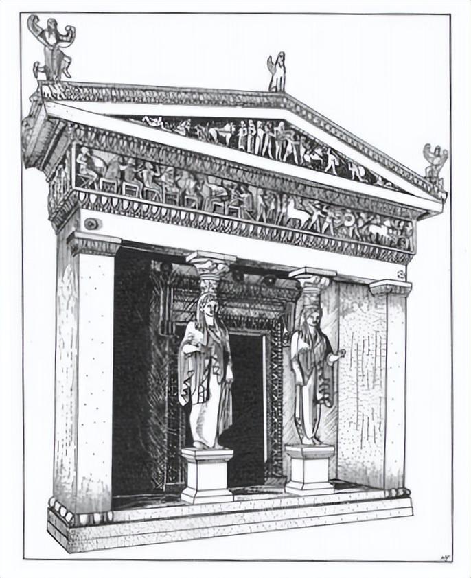 通常的两根支撑门廊的柱子在这里被雕刻成女性的形状,这是希腊建筑中罕见但引人注目的特征。