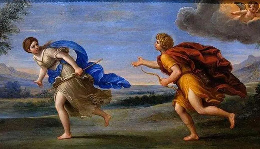因为皮西亚人拒绝为他做预言,赫拉克勒斯偷走了神圣的三脚架。阿波罗抓住了它,两人挣扎着把它从另一个人手中拉出来,在他们中间站着仲裁员宙斯,场景中最高、最壮观的人物,站在三角三角形的中心。
