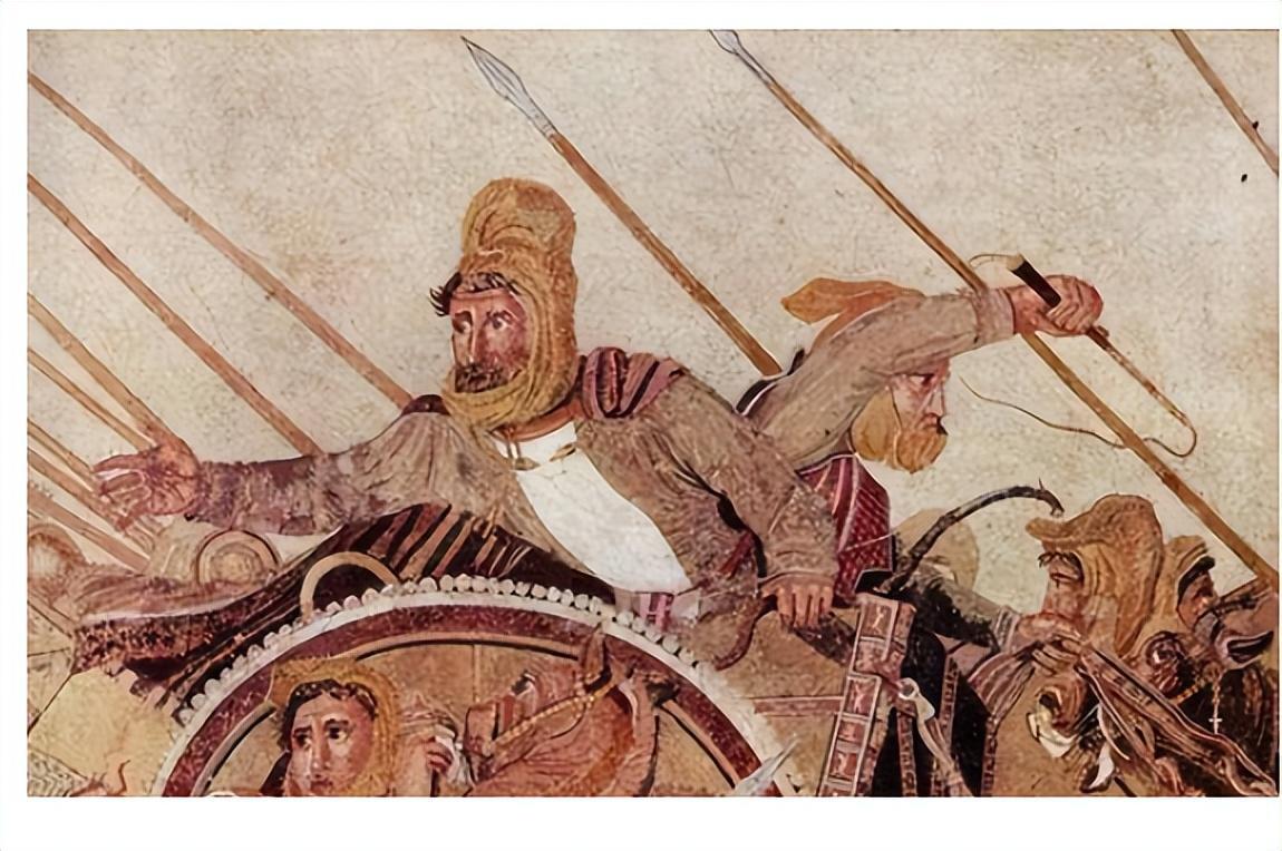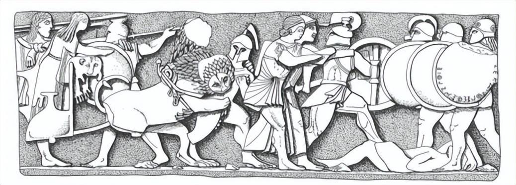 一种深度的错觉是由重叠的盾牌和人物给予的,但由于更遥远的数字并不比前景中的数字小,正如我们在自己的绘画惯例中所期望的那样,这种错觉对我们是无效的,这一幕仍然绝对是二维的,油漆的痕迹提醒我们,饰带应该被涂成彩色的。