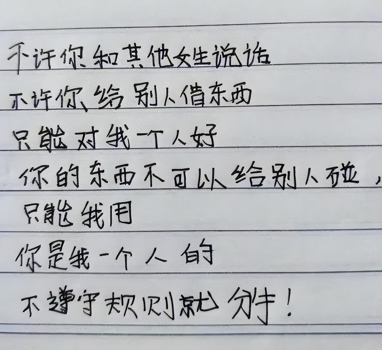 下面这封情书同样是“霸气外露”啊,是为女生写的,不许对方和异性说话,不许借东西给别人,只能对自己一个人好,最后还要告诉对方:“不遵守规则就分手!”