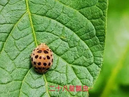 二十八星瓢虫,背部有28个黑色斑点,也俗称为花大姐,花媳妇。这种瓢虫是农业中最常见的一种瓢虫。 又叫马铃薯瓢虫,成虫体型呈半球形,外表为红褐色,全身密布黄褐色细毛,两鞘翅上共有 28个斑点。属于植食性瓢虫,主要危害茄科、豆科、 葫芦科、菊科、十字花科等植物,及大豆、马铃薯等粮食作物。分布在温带、亚热带及热带地区,我国主要分布在华东、华北、西北、西南及华中地区。