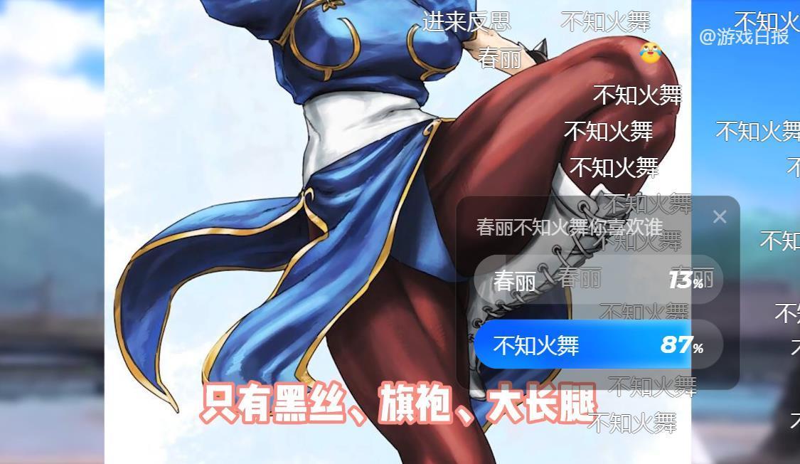 通过玩家投票可以看到,不论是在以春丽为主角的内容中,还是在以不知火舞为主角的内容中,不知火舞均获得了压倒性的票数优势。在B站上万玩家的投票中,90%的玩家选择了不知火舞,选择春丽的只有刚刚10%。