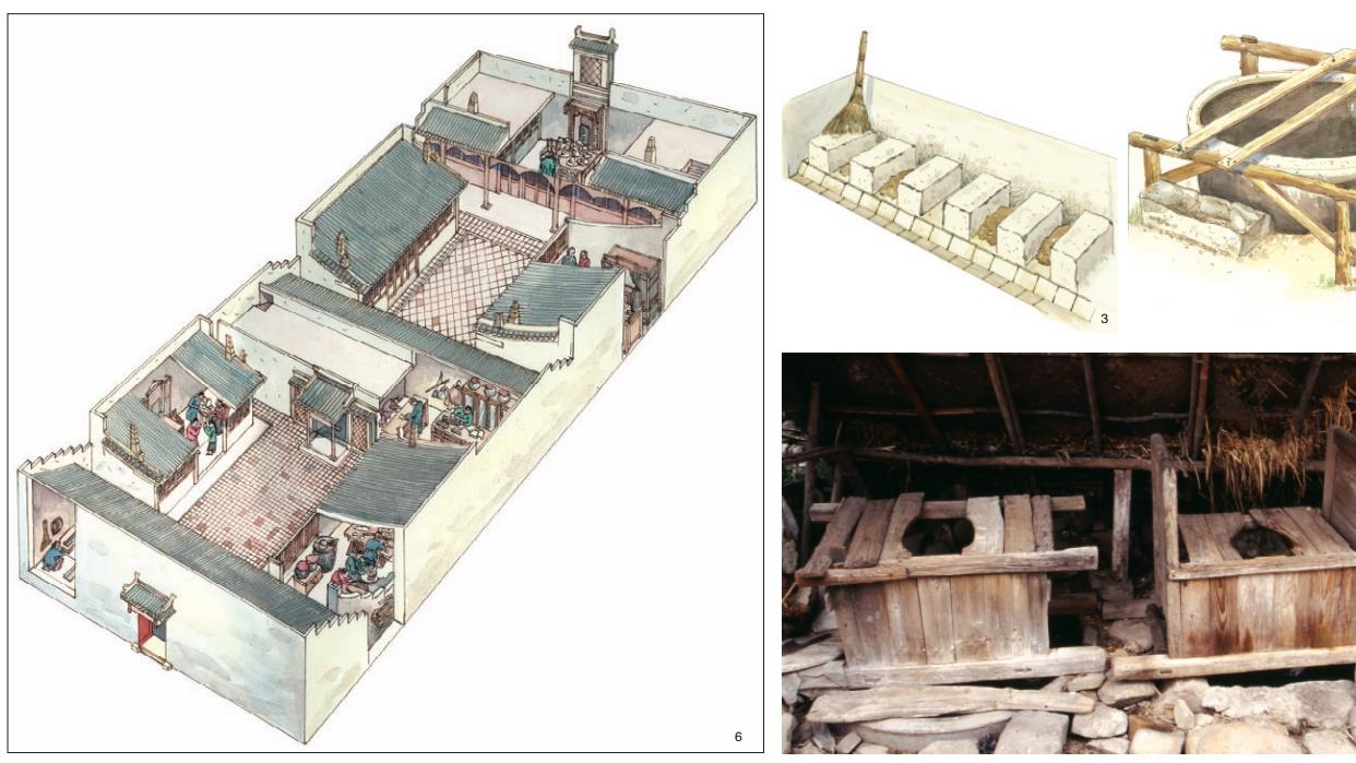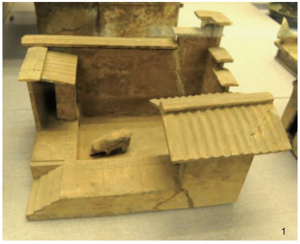 “厕”这一名称也早在春秋时代就已出现,但以后也是厕圈不分,《前汉书》卷六十三上有“厕中豕群出”3)的记载,说明厕也是猪圈。这种厕圈不分的情况在许多地区一直保存到今天。直到上世纪90年代的河北乡间,很多地方都保留一种连茅圈,也就是人在前面大便,大便顺一槽流下,猪在后面吃屎。这种厕所在汉代的出土明器中常常可以看到,可见这种厕所有相当悠久的历史(图1)。