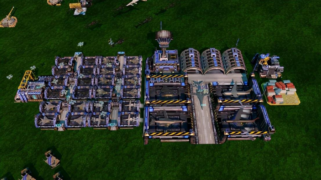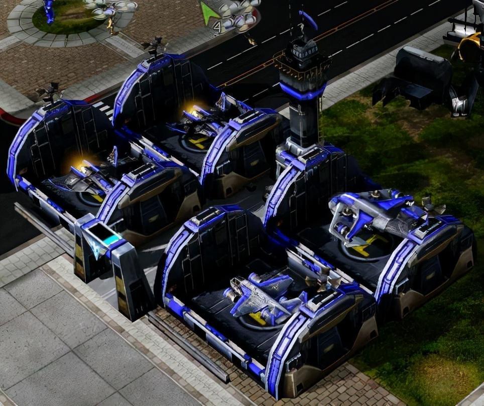 盟军的飞机由于基本都是采用垂直起降,因此空军基地只有四个机库与一个控制塔。这些机库不仅用于存放飞机,他们还负责重新武装,并用无人机对飞机进行维修。