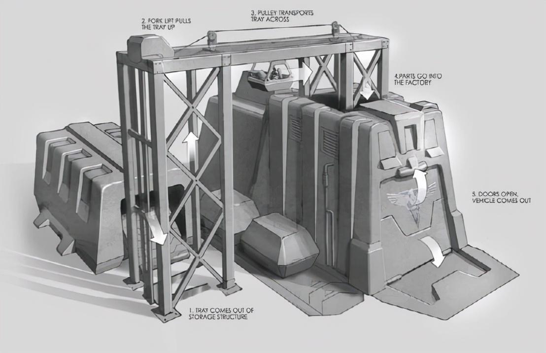 根据建造厂的概念图所示,原本盟军建造厂的造型更加科幻风,门口一个吊索,房顶一个机械臂,中间放置一个横向的传送带,基地内都是rgb,感觉像是将工厂常见组件以一种狂放的姿态组合在了一起。但是似乎由于建模比较复杂等原因,最后盟军建造厂变成了正式版那种偏中规中矩的造型。