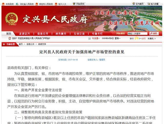 这标志着定兴县的房地产管控政策,由限购和限贷,扩展到了限价。