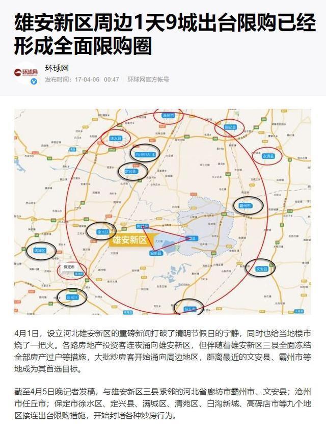 为控制周边飙涨的房价,确保新区建设正常进行,新区设立后的第一时间,雄安三县全面冻结全部房产过户。紧接着,新区周边各县市也纷纷出台严厉的房地产管控政策。