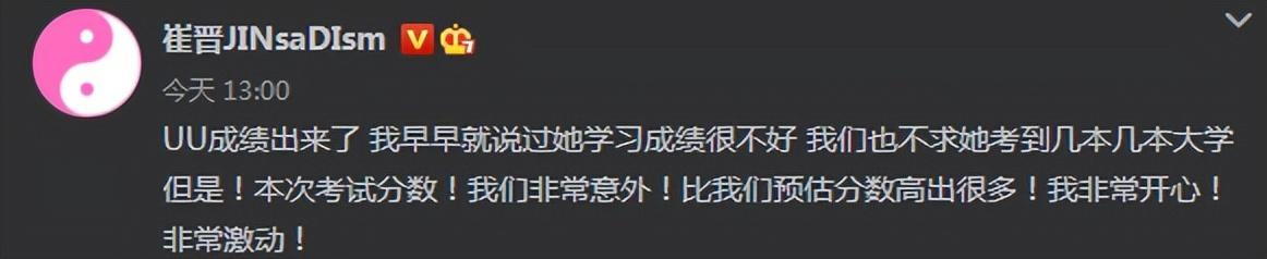 在高考期间,晋妈和崔晋发的视频中,每考完一场李勒优都说题很难,那个时候所有人都觉得考砸了,对她的高考成绩也不抱希望了。直到崔晋在社交平台宣布,李勒优高考成绩已经出来了,才让人意识到原来还有小惊喜!