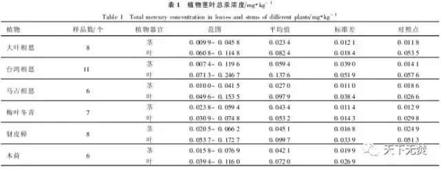 再经过一些对比分析后,作者发现,清水河垃圾焚烧厂周围植物叶总汞浓度显著高于Rasmussen等研究的Ontario地区植物叶总汞含量。而且,国外大多数地区所报道的植物总汞浓度集中在0.010~0.015 mg·kg-1,平均值在0.024 mg·kg-1。而清水河垃圾焚烧厂周围6种优势植物茎与叶的总汞浓度平均值分别达到了为0.041 7 mg·kg-1和0.094 8 mg·kg-1,均显著高于国外同类报道的平均值,表明研究区内的植物已经受到一定程度的汞污染。