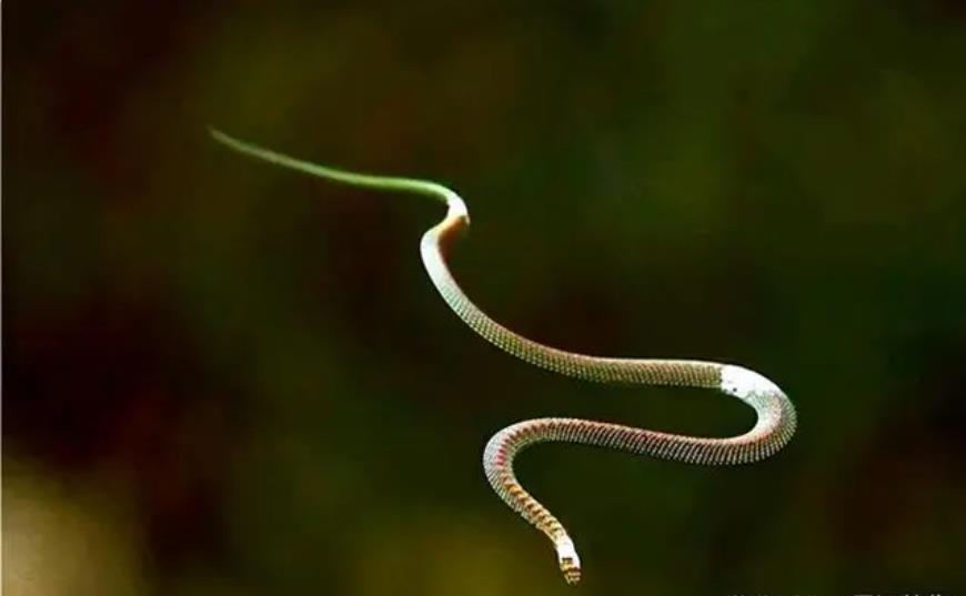 世界有一种蛇叫金花蛇,在飞行的途中,金花蛇会极力地撑开自己的肋骨,使自己从圆柱体变成一个相对扁平的形状,从而可以进行滑翔。