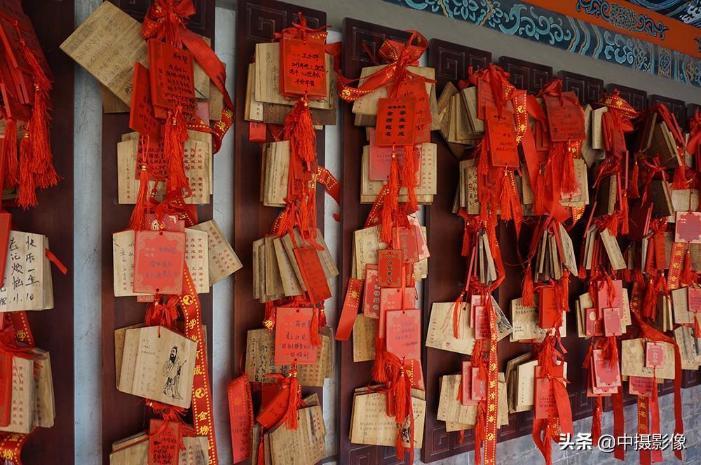 在大成殿前的东西两侧是红柱长廊,这里是布置展览供游人参观的地方。本记看到,东边长廊内挂满了请愿帖 ,学业有成、考上重点大学等一些美好的祝福语。