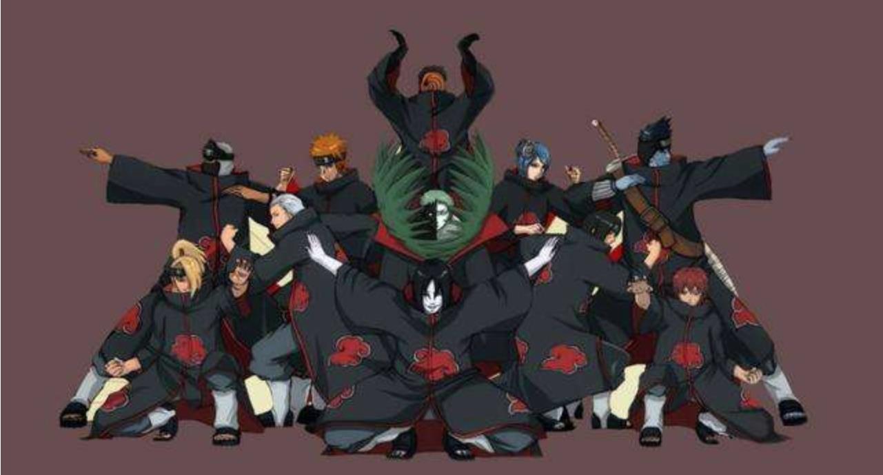 “晓组织一共有11为成员,分别是阿飞、飞段、宇智波鼬、大蛇丸、迪达拉、角都、干柿鬼鲛、蝎、绝、小南和佩恩。“晓”最初由自来也的弟子——雨忍者村孤儿弥彦、长门、小南创建,弥彦是首领。当时的“晓”只是一个雇佣兵组织,初衷是实现忍界和平。长门身上拥有宇智波斑移植的轮回眼,斑为了实行月之眼计划,”