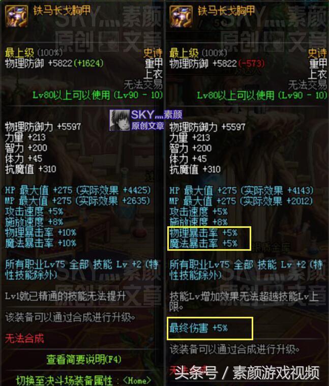 铁马套头肩、腰带、鞋的改动情况都是相同的,这里就以头肩为例来对这三个部位的加强程度进行一个分析。改版后的铁马头肩将所有属性强化数值从26点上调至30点,新增4%的力量、智力加成,但与此同时删除了原本10%的暴击率加成。