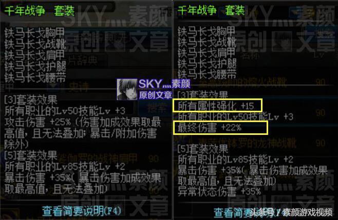 首先在[3]套装效果方面,保留对50级技能等级+3的效果;删除原本的20%黄字伤害加成,用22%最终伤害、15点所有属性强化加以替代。[5]套装则保留原有的所有效果,新增35%的异常状态伤害加成,异常状态伤害这条属性,我在近期已经为各位分析过了,对除毒王之外的大多数职业来说是无关紧要的。整合一下铁马套发生改动的属性:
