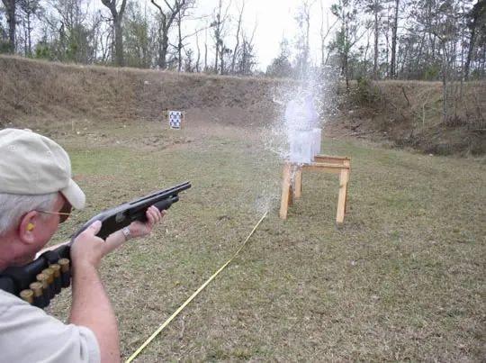 射击前我们再来科普一下,即便6号鸟弹的弹丸总重量接近600gr,但是实际上弹丸出膛后的穿透力取决于每个小弹丸的重量和速度,在速度没有太大变化的情况下,每个小弹丸的动能其实并不大,对目标的侵彻深度也有限,这也可以解释为什么打鸟就只适合用鸟弹,如果你用鹿弹打鸟,分分钟得到的就是一堆碎肉....