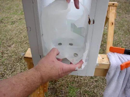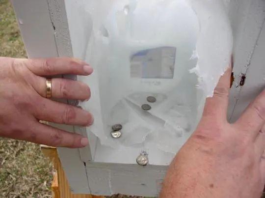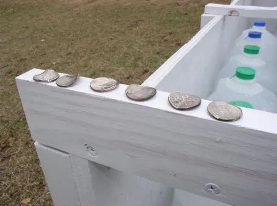 接下来射击距离拉到15英尺,目标是一加仑的纯净水桶,如图所见,硬币霰弹打爆了第一个水桶并产生了很壮观的水雾,但是当走近一看,第一个水桶背面没有被打穿,这意味着虽然动静很大,但是硬币霰弹的侵彻力不足3英寸,如果用来打丧尸,硬币应该无法对目标造成有效毁伤,更别说好像《生化危机4》里面那样打爆巨锤男了。