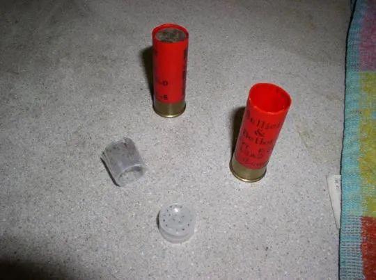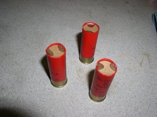 然后,找来几发12号口径的6号鸟弹,切开收束封口倒出小弹丸。10美分硬币的直径与弹托非常接近,没有办法硬塞进去,只能把弹托的一部分切掉,只留下底座,然后霰弹里面可以叠放入16枚10美分硬币。