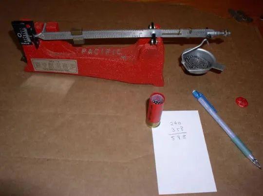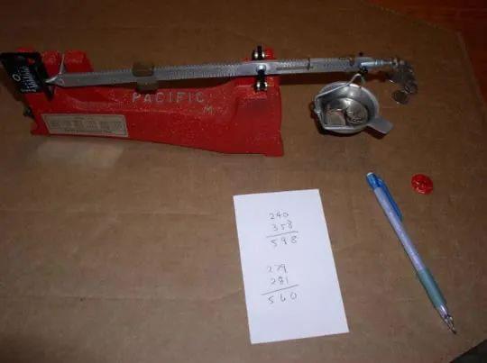 然后鸟弹里面倒出来的小弹丸我们也称了一下,总重量598gr,每一个小弹丸的重量大概是1.8gr,算了一下,正常的6号鸟弹里面大概有333颗小弹丸;而16个10美分硬币的重量大概是560gr,投射的重量差不多,这样可以确保霰弹原有的装药能赋予硬币霰弹正常的初速。