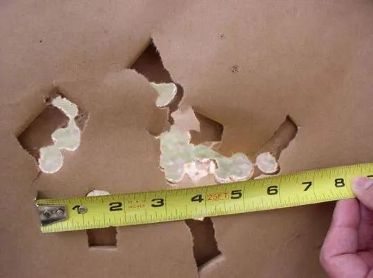 (硬币正中木板打出的凹坑,侵彻深度非常浅)