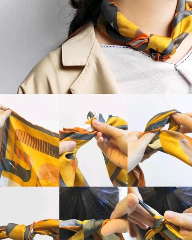 项链式系法是比较显气质的一种系法特别是黄黑相间的方巾,系上后特别美。