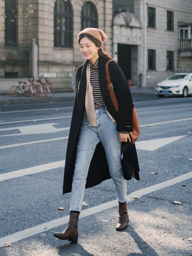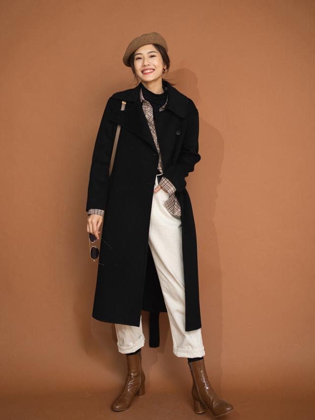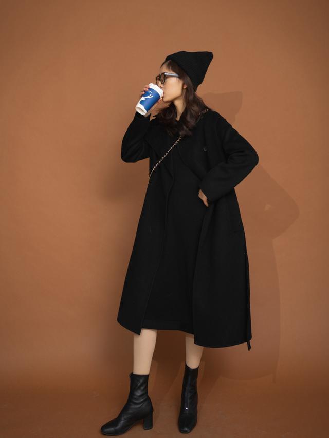 在这种穿搭中,我们需要注意两点。第一,内搭的颜色最好与大衣的颜色相同,以便于相互呼应,增强造型的协调感。也就是说,最好是用黑色打底衫来搭配黑色大衣。