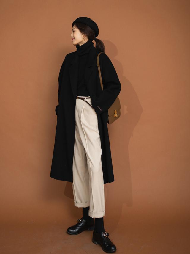 此外,我们也可以在“配色”上简约,比如黑色大衣+黑色毛衣+米色烟管裤的搭配,整个造型就使用了黑色和米色两种颜色,虽然简单,但充满了高级利落范,让人越看越喜欢。