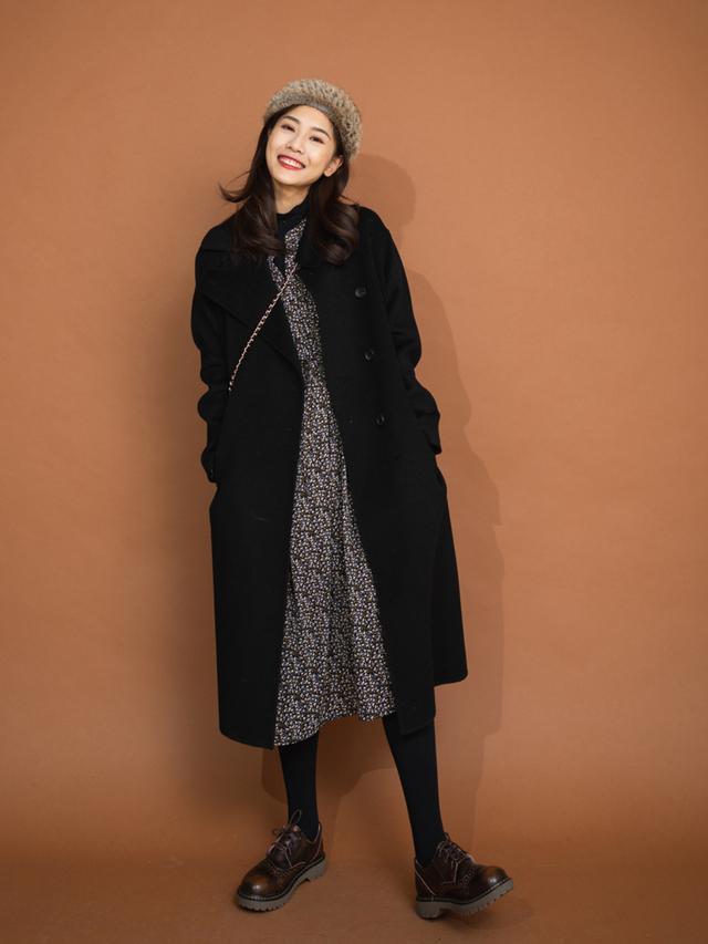 如果觉得同色系搭配实在太过单调无趣,那我们还可以用“碎花连衣裙”来搭配黑色大衣。颜色丰富的碎花元素,可以轻松打破黑色大衣的枯燥感,让造型配色变得丰富起来。不过,因为碎花连衣裙面料都较为轻薄,所以大家一定要套上保暖御寒的打底衫和打底裤,不要为了风度而丢了温度!