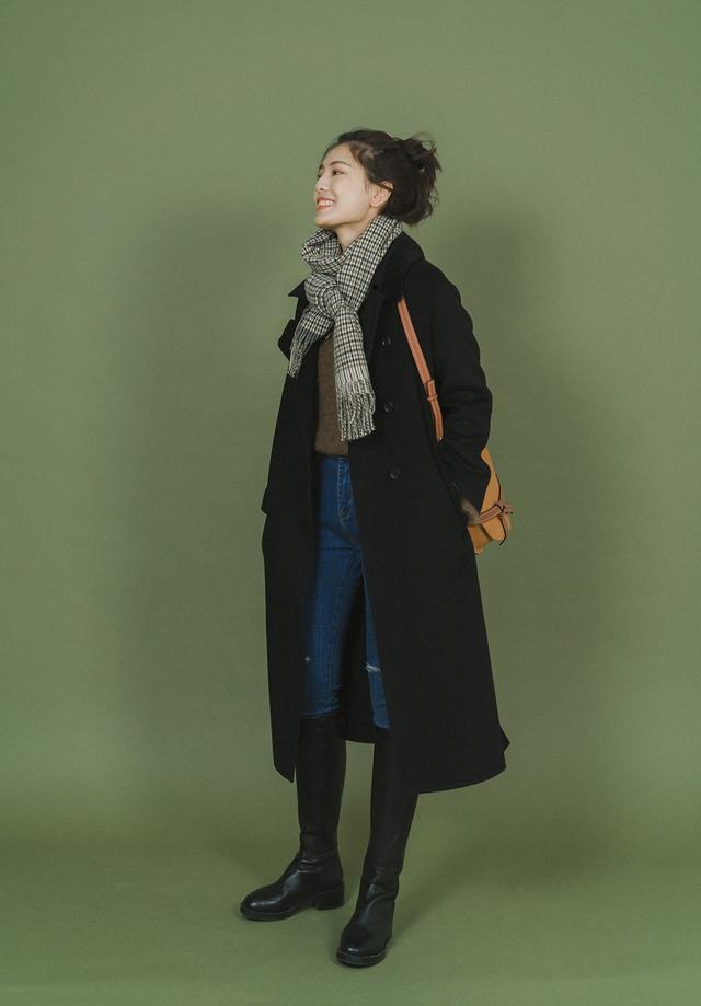 look2:黑色大衣+围巾+毛衣+牛仔裤