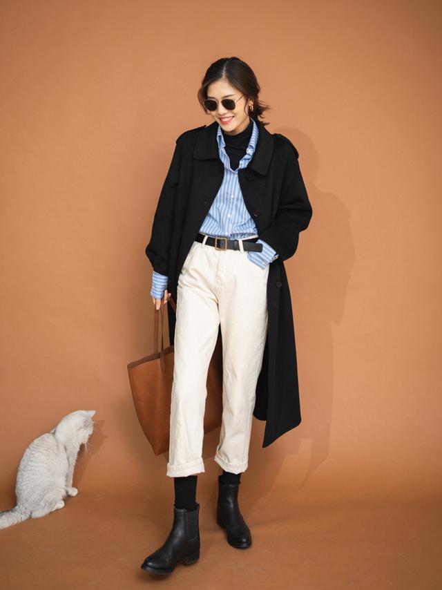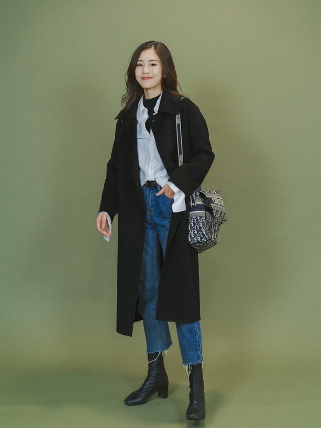 所谓的三层叠穿也就是“黑色大衣+中间层+打底层”的搭配,而想要塑造出干练气质感,我们就可以用衬衫来作为中间层,更具利落正式感。