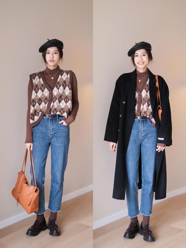 一件菱格纹马甲,搭配上棕色修身内搭+高腰牛仔裤,再穿上一件黑色大衣,层次鲜明,风格突出,特别适合二三十岁的姐妹选择!