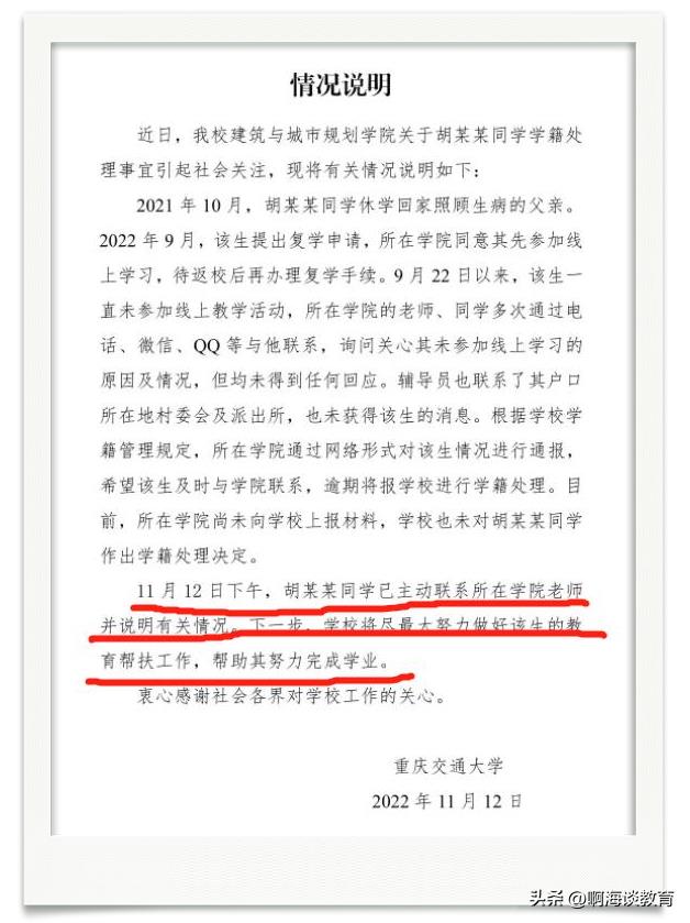 现在事情已经圆满解决了,回过头来看,实际上大家有点错怪重庆交通大学了,实际上学校为了胡同学的复学还是做了一定的工作了。本人联系不上,也联系了唯一的哥哥,也请求了当地警方协查,但是一直未果,这才有了退学通知书。
