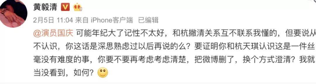 对于张国庆所谓不认识杭天琪的说法,同为娱乐圈人士的黄毅清似乎非常的不屑,直接点名对方: