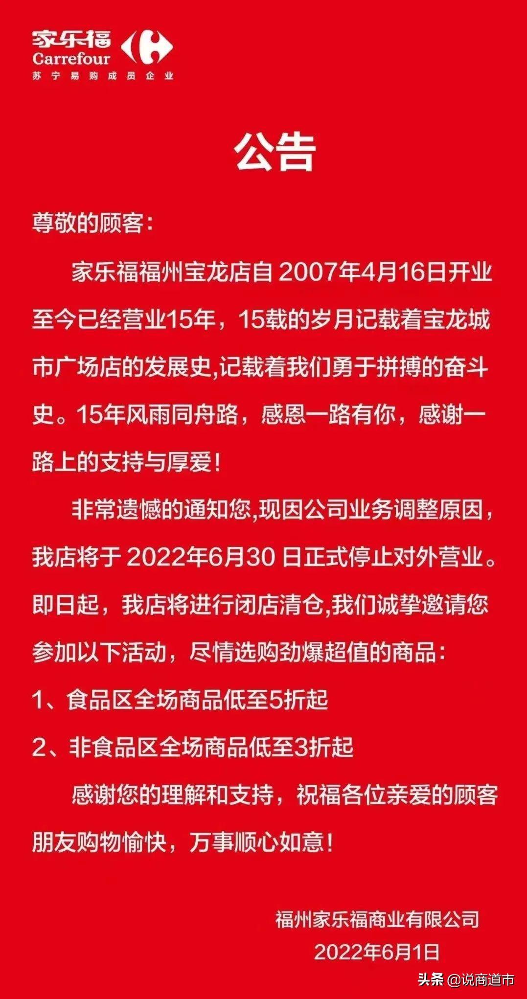 今天,家乐福福州宝龙店对外发布公告,宣告6月30日停业!