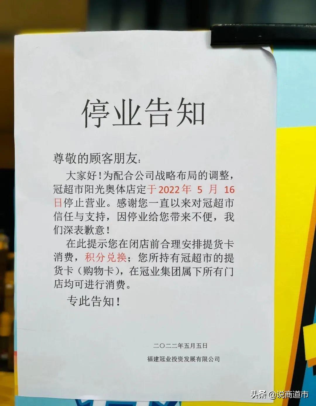 日前,位于仓山区盘屿路阳光天地广场1层的冠超市阳光奥体店发布停业告知:为配合公司战略布局的调整,定于今年5月16日停止营业。