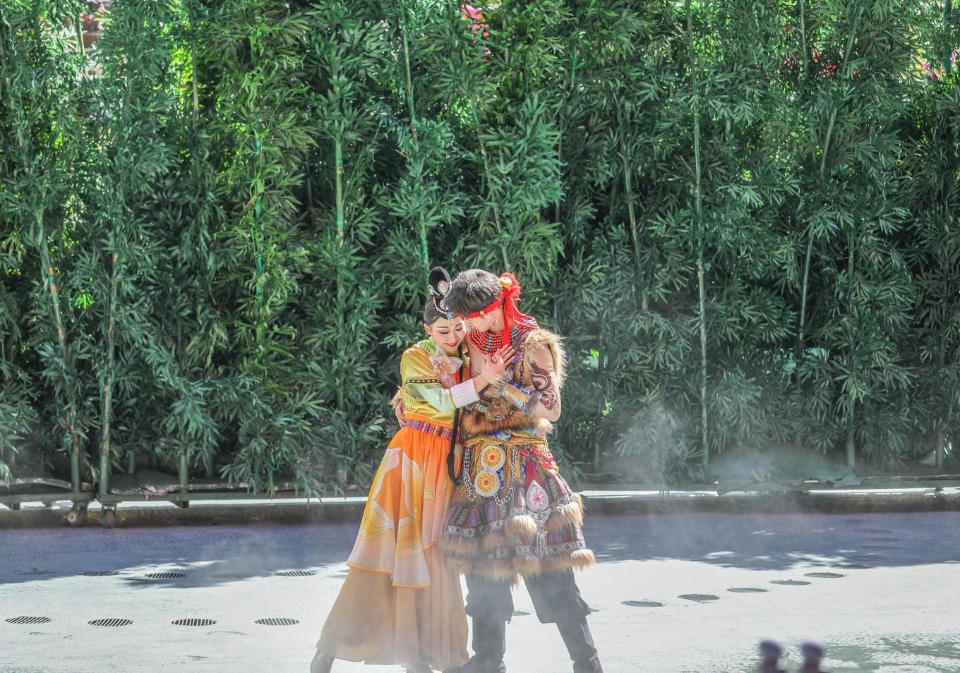 突然,部落一边的雪山瞬间爆发,整个部落地动天摇,火光冲天,坐在观众席的我们,都真实地感受到了火扑过来的炙热。场景非常的震撼。