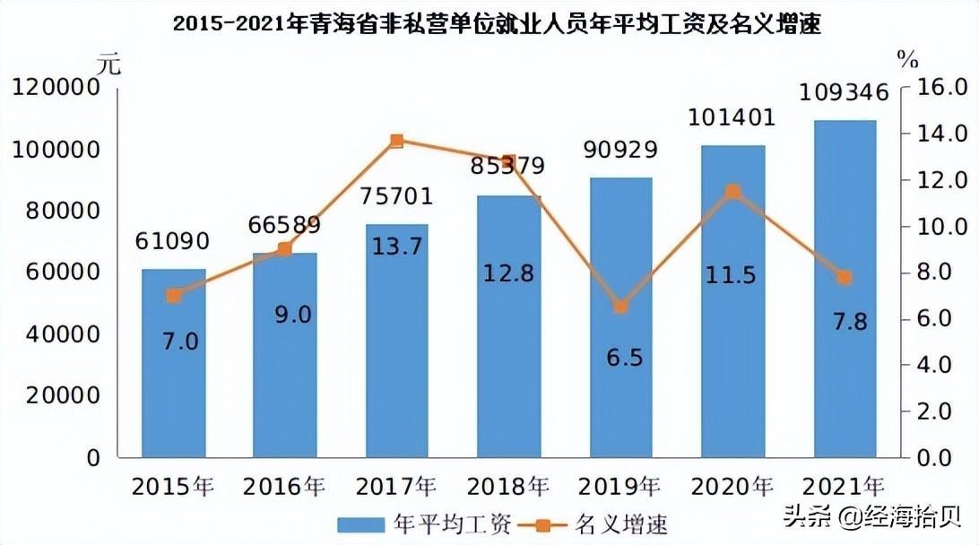 让人意外的是,西部省份青海省表现亮眼,可谓是一枝独秀:2021年青海省城镇非私营单位年平均工资达到109346元(相当于9112元/月),同比名义增长7.8%,年均工资排名第四位,达到全国平均工资106837元水平,超过了第五名的重庆市(101670元)和许多中西部省份、以及西南、沿海等地区。不仅如此,而且在2020年,青海省非私营单位年平均工资就已经达到10万元。