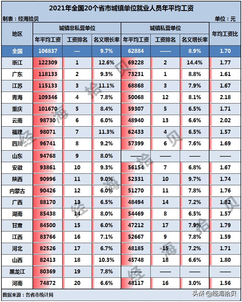 20个省市年平均工资出炉:浙江广东整体最高,青海云南差距最大