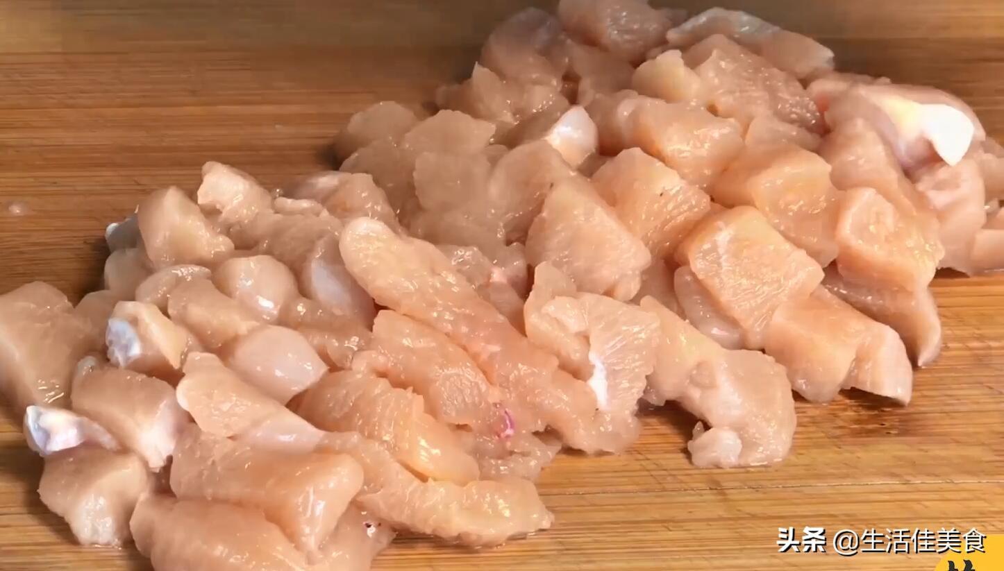 第四步:准备两块洗干净鸡胸肉,去掉多余的鸡油脂肪,改刀先切成厚一点的片,再切成粗一点的条,最后切成肉丁,切好备用。