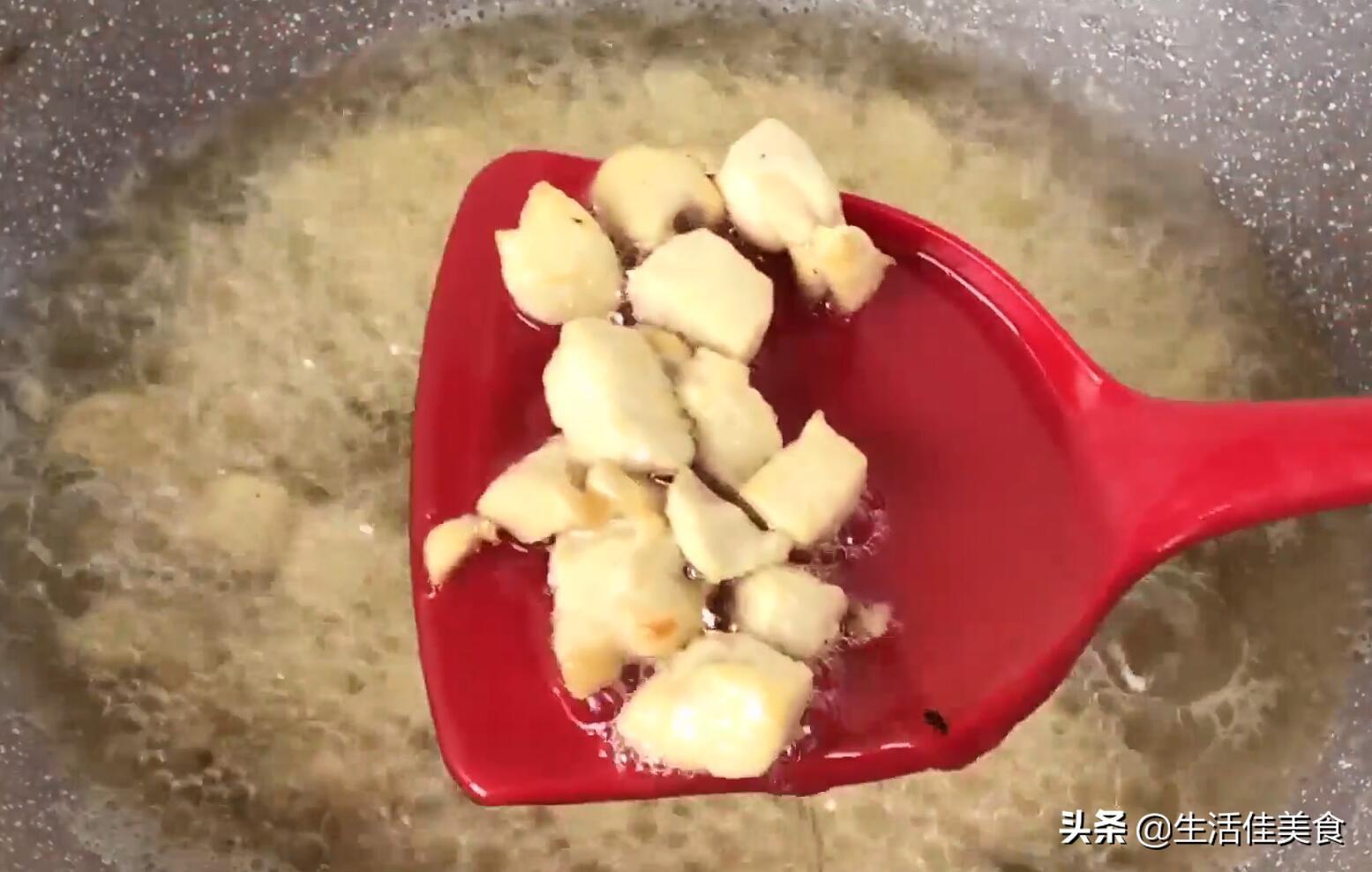 第六步:接着下入鸡胸肉至锅中,开小火慢炸,把鸡胸肉里面的水分炸干干净,一直炸到肉丁表面微微发黄说明水分已经炸干了。