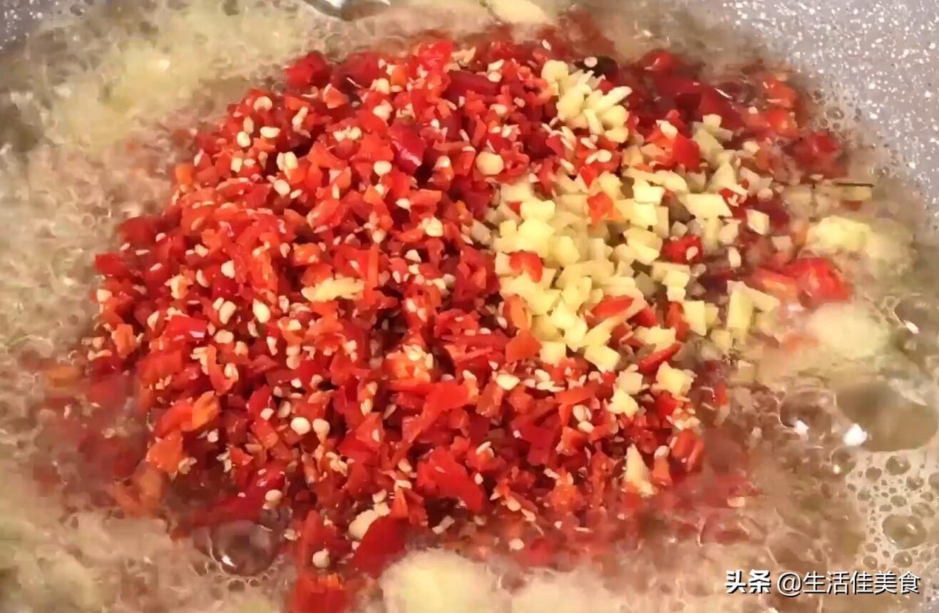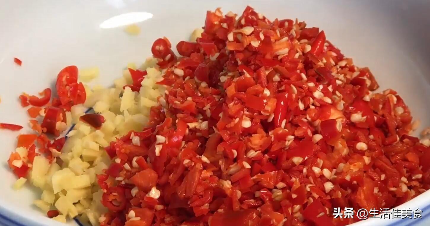 第二步:生姜洗干净之后先切成片再切丝,最后切成姜末;再准备一斤新鲜的红辣椒,洗干净之后晾干水分,再将辣椒剁成碎末,备用。